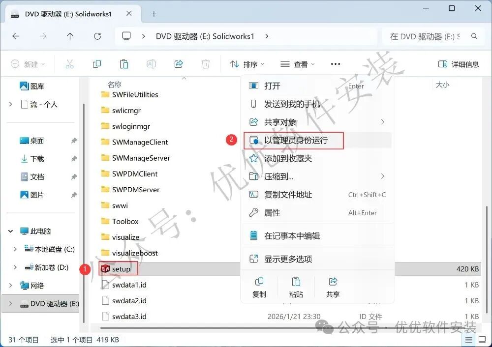 13、找到【setup】应用程序,右键选择【以管理员身份运行】它