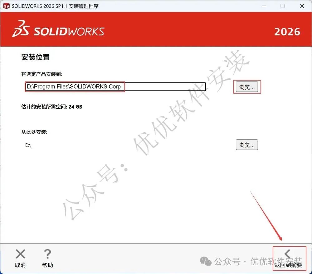 19、软件默认安装在C盘,可自定义更改软件安装位置,这里小编选择安装在D盘;点击【返回到摘要】