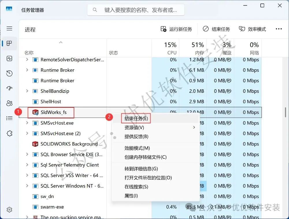 29、找到【SldWorks_fs】,再点击【结束任务】
