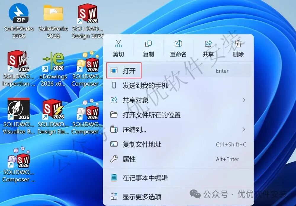 35、回到桌面,右键桌面上的【SolidWorks 2026软件图标】,点击【打开】