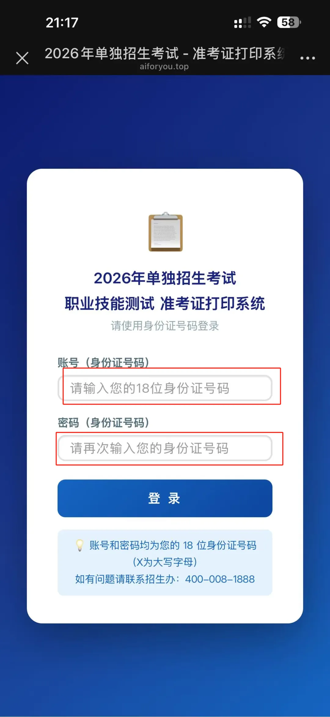 登录界面中输入考生身份证号码、密码(身份证号码)点击登录。