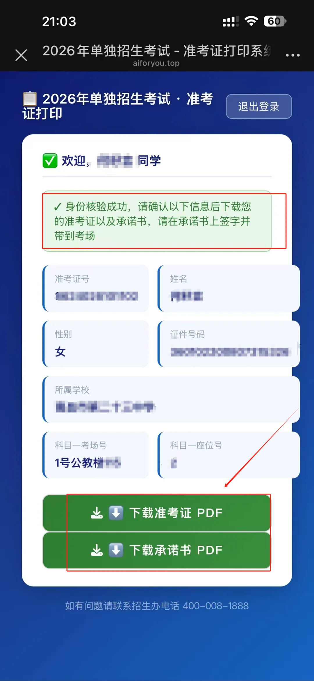 确认信息无误后下载准考证及承诺书(承诺书上需签字一并带到考场)