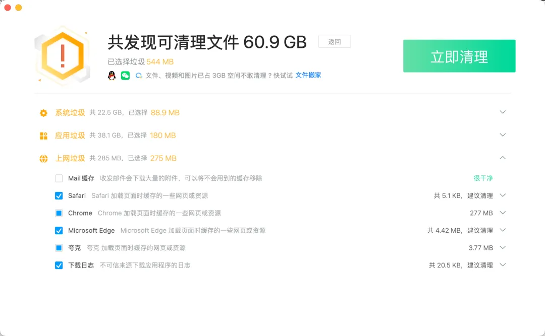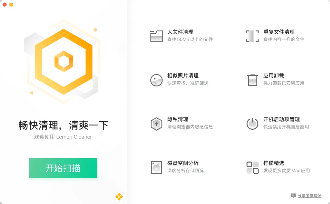 最近Mac电脑上装了很多AI的软件后,硬盘急速下降,500G的硬盘肉眼可见的剩余50G了,没办法只能抽空好好清理一下。以前我都是在系统设置-存储空间那里看下哪些文件占用存储多我又不用了就把它删了腾出空间,前几次这么搞还行,但最近这样搞越发腾不出什么地方了,没办法我只能想着找找新方法。以前我一直用的是Windows,有很多免费的垃圾清理软件,但是MacOS这边我上网查了查后没有什么类似的免费清理硬盘的软件,我同事有用的是收费版的我忘了什么名字,今天问了几个AI反倒是找到了好用的,体验比我之前手动翻 Finder 清文件夹高效很多,也更适合大多数普通用户。这里分享一下:腾讯柠檬,这个是下载地址:https://lemon.qq.com/ 。软件免费还很好用,所以必须推荐一下。主要功能如下:畅快清理,就类似于Windows上的垃圾清理软件,扫描出的东西基本上可以一键清理,不放心的可以再看下,然后也可以勾选一些自己认为可以删除的。我先用这个功能清理出了50多G的空间。接着就是磁盘空间分析功能,它能帮你快速定位“到底是谁在吃空间”,会扫描整个硬盘,然后将所有文件按大小排列出来,就是下面这样的,这个需要自己去一个个找那些占用空间大的文件,然后判断要不要删除,不确定的可以问 AI 或者不删除即可。这块我腾出了100多G的空间,主要下面几类情况: