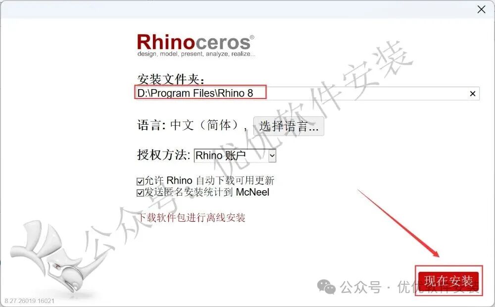 5、软件默认安装在C盘,可自定义更改软件安装位置,这里小编选择安装在D盘;全部不勾选,再点击【现在安装】