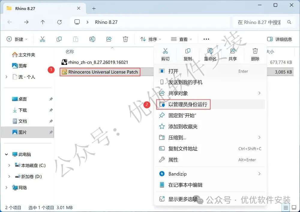 8、回到Rhino 8.27文件夹,找到【Rhinoceros…Patch】程序,右键选择【以管理员身份运行】它
