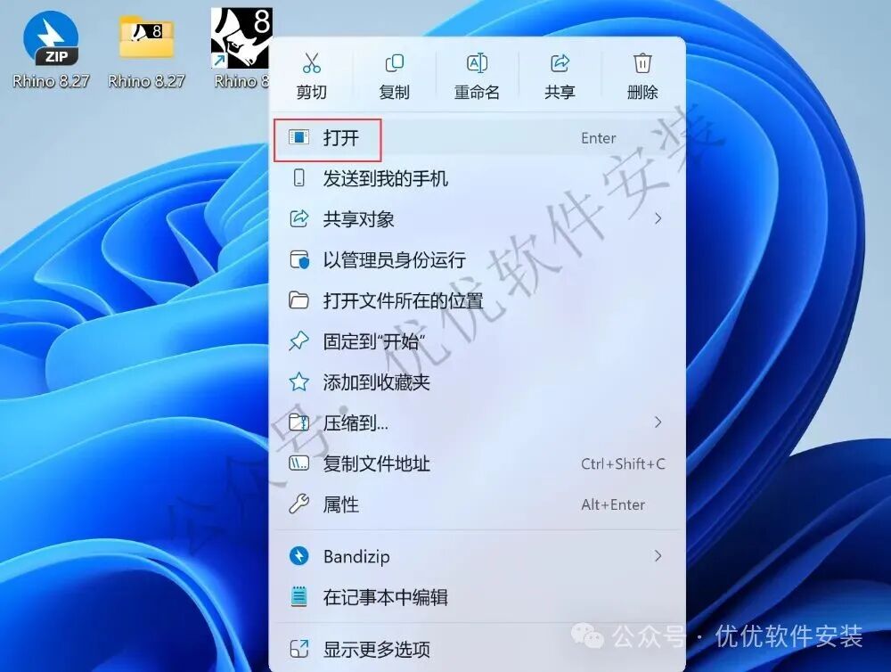12、回到桌面,右键桌面上的【Rhino 8软件图标】,点击【打开】
