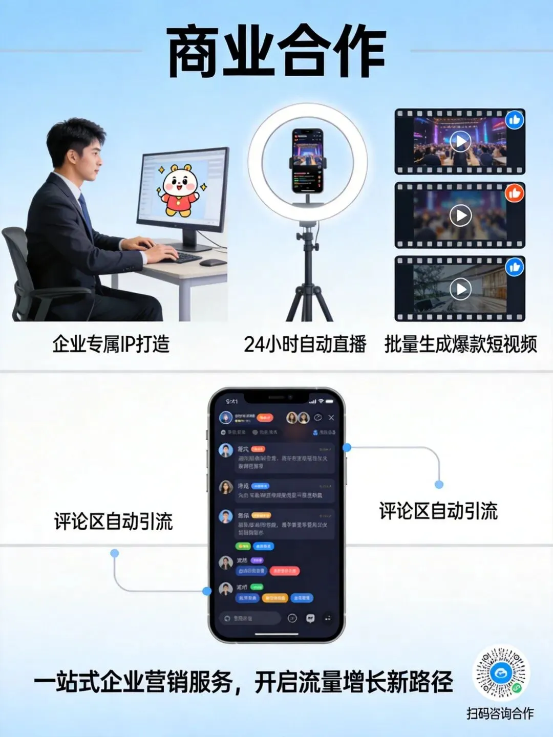 24小时不间断输出爆款内容 自动生成不同场景版本 多账号矩阵同步分发 评论区自动互动截流