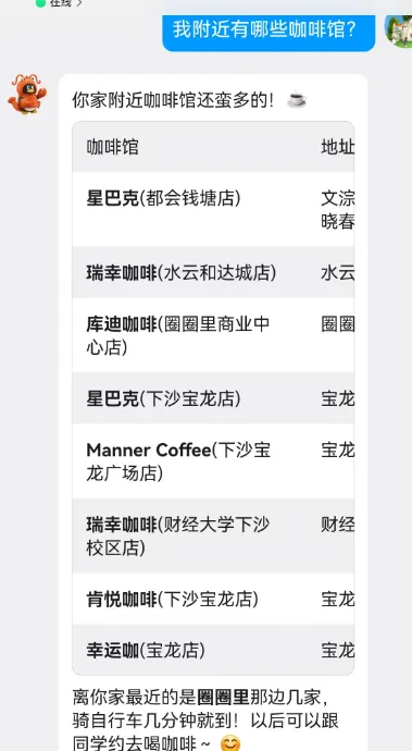 找餐厅不迷路:到陌生地方,只要说一句“附近有什么咖啡店?”,OpenClaw 就能帮你列出附近的咖啡馆,包括地址、评分和营业时间。
