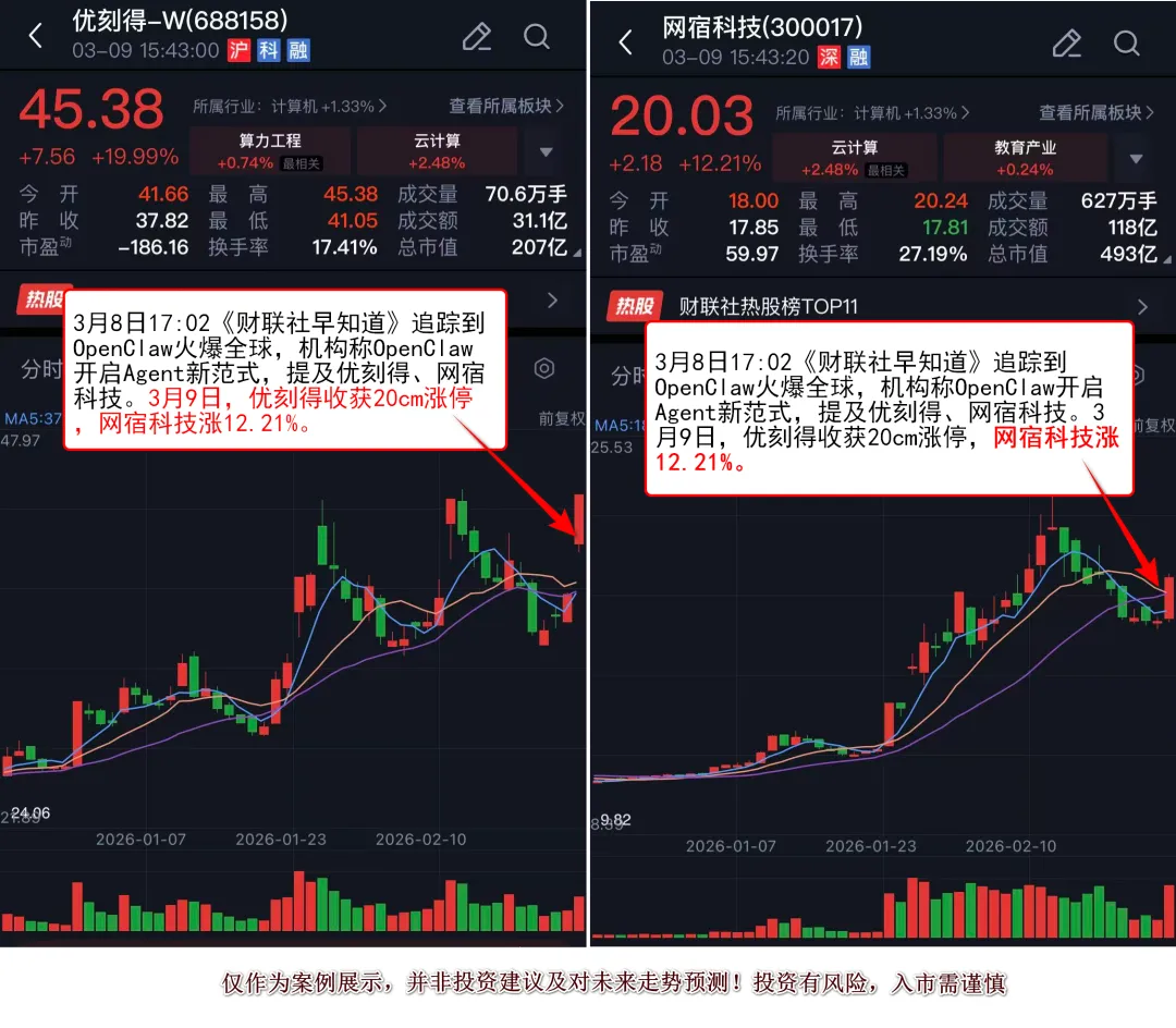 随后栏目梳理到2家核心公司,其中优刻得于1月下旬率先推出了部署Openclaw(Clawdbot)的相关镜像,为行业内率先实现云端部署的厂商;网宿科技GPU算力平台基于网宿广泛分布的节点资源,提供轻量化算力资源,支持GPU虚拟化,可满足轻量AI任务场景的需求。优刻得在3月9日收获20cm涨停,并在3月10日持续大涨,网宿科技在3月9日大涨12.21%。