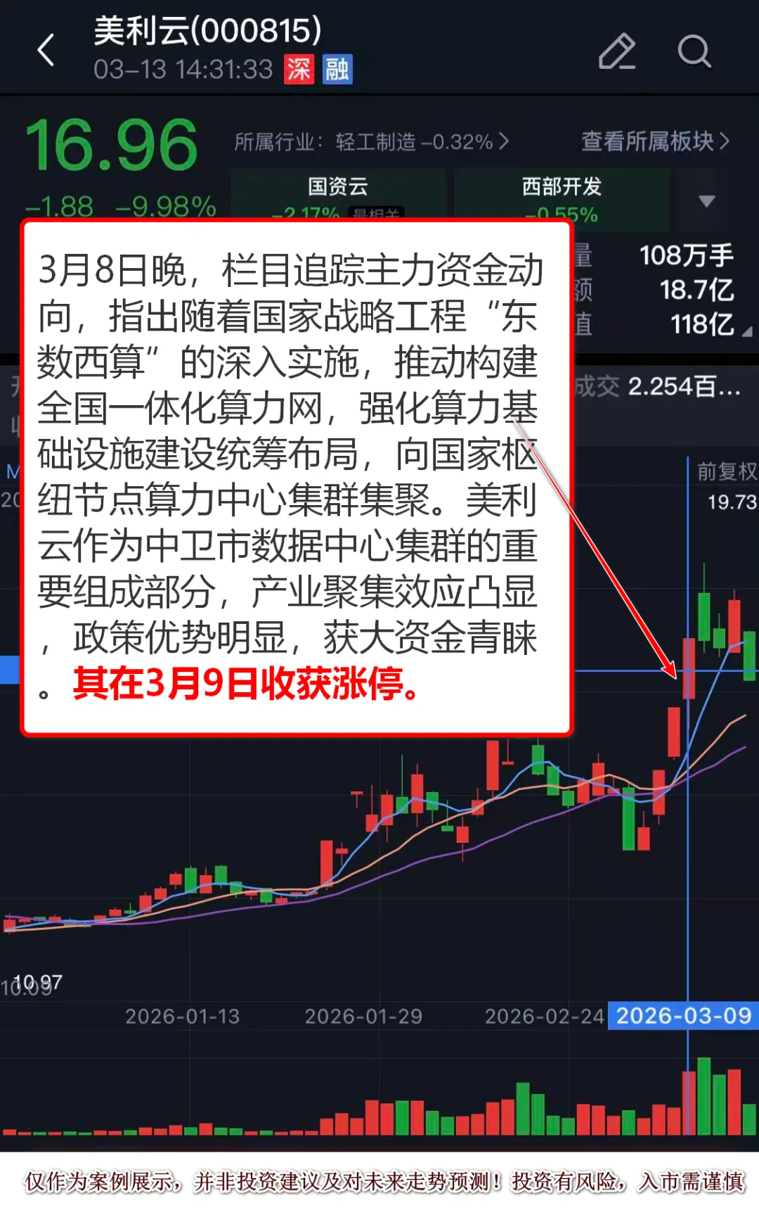 算力方向受到热度扩散表现活跃。3月8日晚,栏目追踪主力资金动向,指出随着国家战略工程“东数西算”的深入实施,推动构建全国一体化算力网,强化算力基础设施建设统筹布局,向国家枢纽节点算力中心集群集聚。美利云作为中卫市数据中心集群的重要组成部分,产业聚集效应凸显,政策优势明显,获大资金青睐。