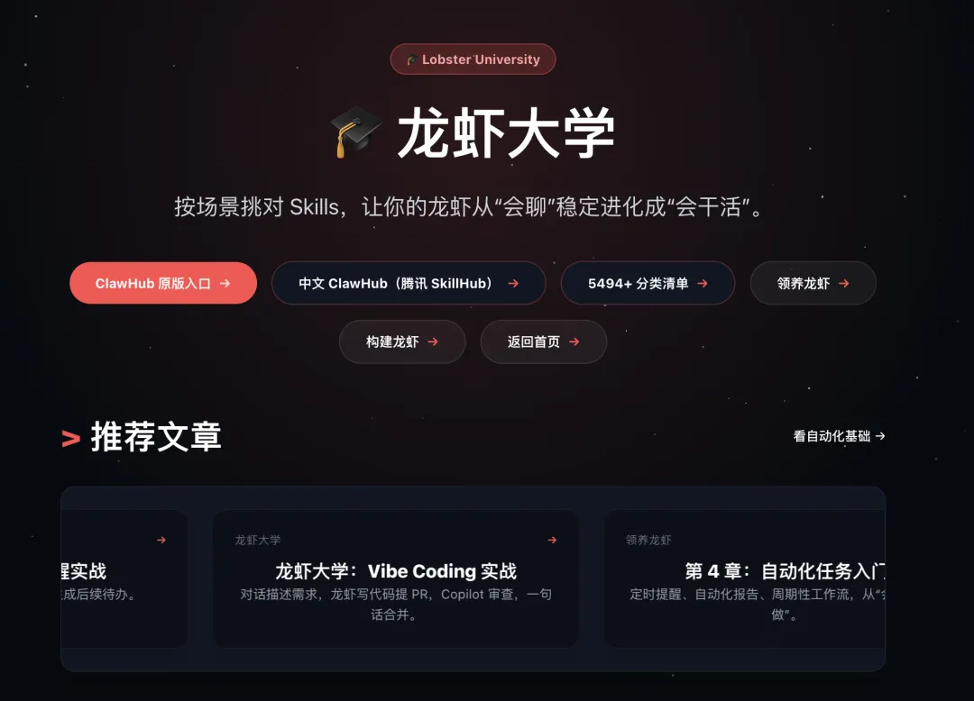 Skills 菜单式选修,持续优化助手能力,探索多元应用场景。包含多 Claw 协同、高频场景案例(邮件助手、财经资讯、Vibe Coding)等专题模块,正在两周内充分迭代,建立第一个开源的完整的龙虾高等院校!