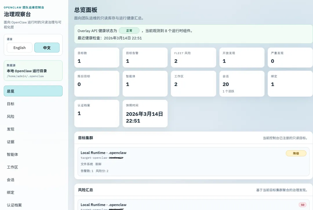 这条路径下,sidecar 默认仍是 mock-first,所以不需要你先准备真实 OpenClaw 状态目录。你可以先把页面结构跑起来,看它如何展示 Targets / Risks / Findings / Evidence / Agents / Sessions / Topology 这些视图。为什么我觉得这条路有价值