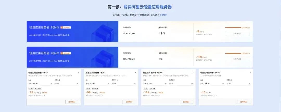 1、前往【阿里云OpenClaw部署专题】页面,页面下拉到轻量应用服务器购买界面。