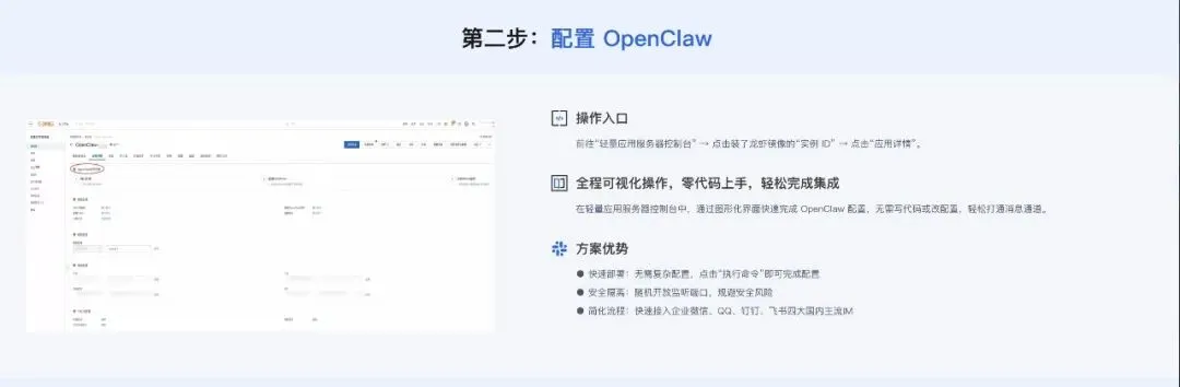前往阿里云轻量应用服务器控制台,进入实例的【应用详情】页面,通过图形化界面快速完成OpenClaw配置,轻松打通消息通道。