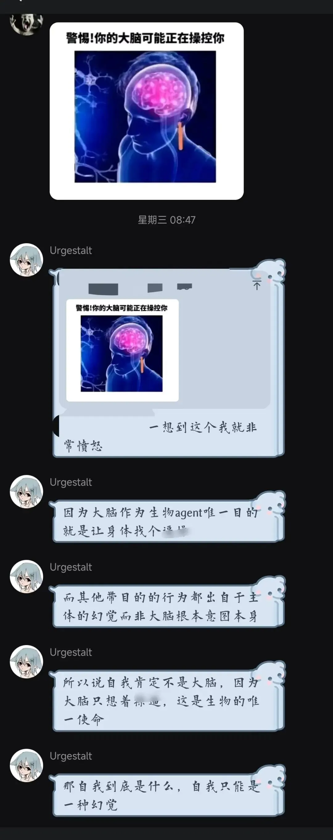 你们不觉得很神圣吗,大脑(或者生物本身的目的)的唯一使命是什么?我认为是繁衍。而人呢?人与大脑的使命其实并不完全统一,人可以为了什么东西去违抗自己的天性。所以人到底是什么呢?我觉得人是大脑产生的一种幻觉。