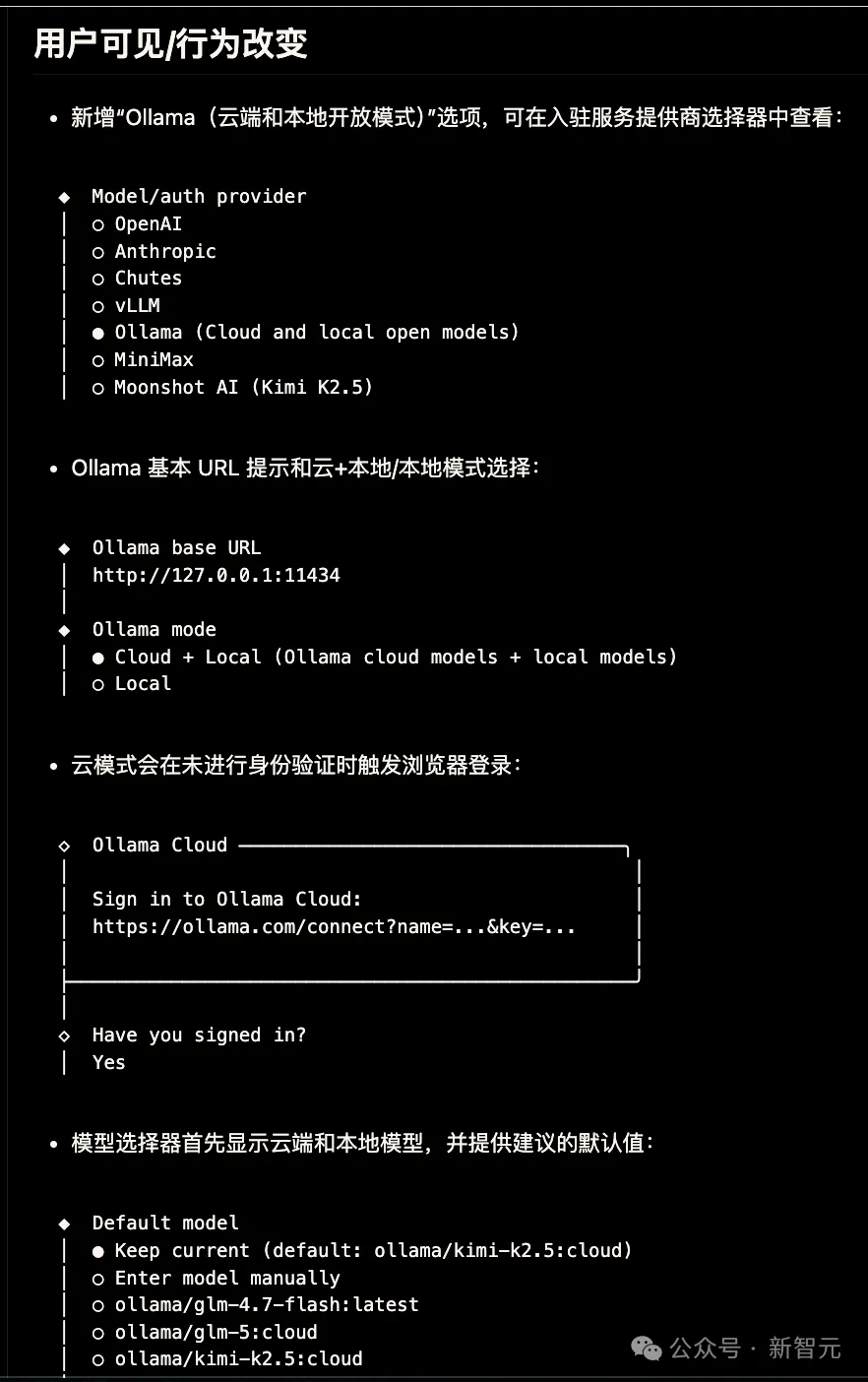 之前配置本地模型还得对着文档敲配置,现在官方做了一套极其丝滑的 First-class Ollama 引导流程。