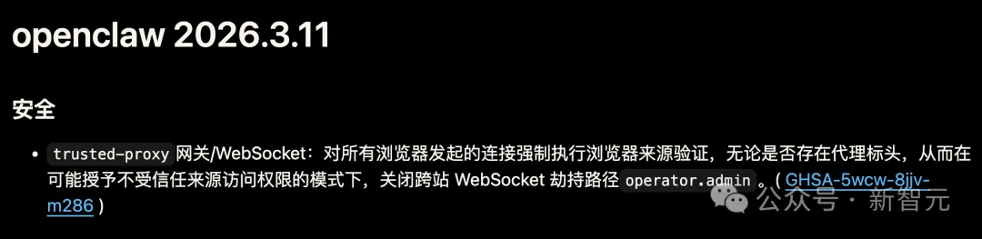 这两版一口气打上了十几个安全问题(GHSA)的补丁,也是所有 OpenClaw 用户为了自己的数据安全,最应该更新的主要理由。