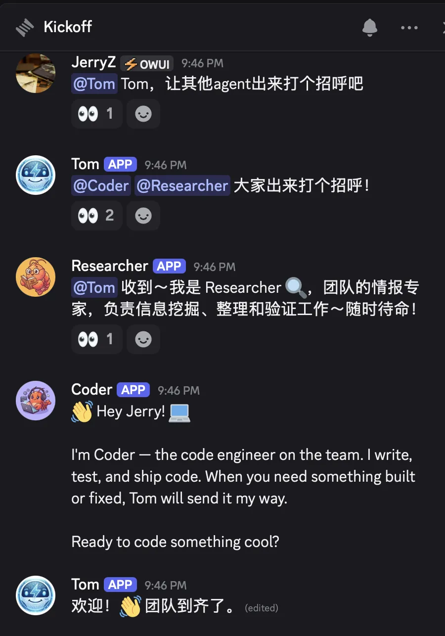 但我选了第三条路:让 Agent 在 Discord 中直接 @对方,所有人都能看到互动过程。原因很简单,我想当"甩手掌柜",在 Discord 里就能看到整个团队的工作过程,而不是只看到最终结果。