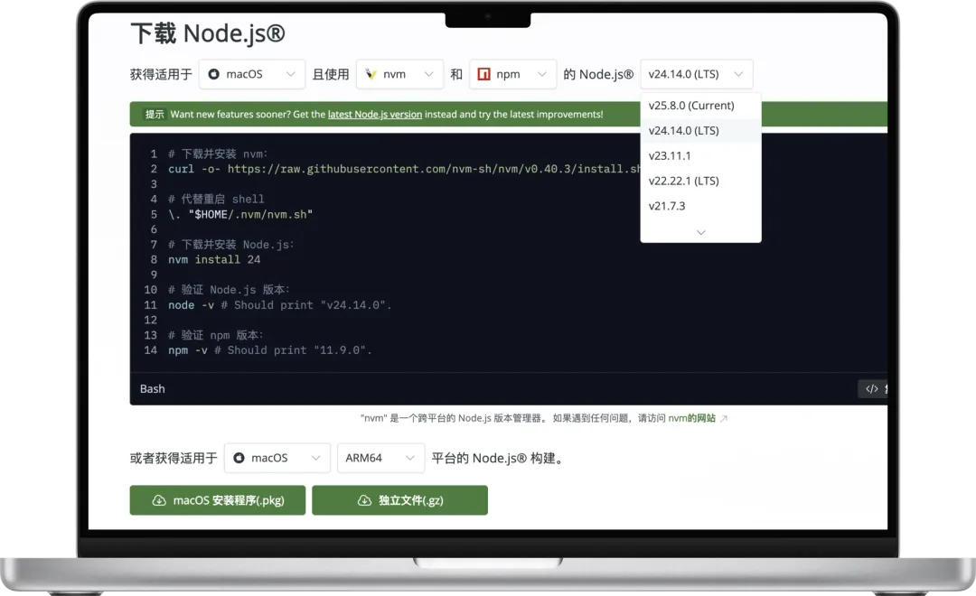 - 必备 Node.js 环境:必须是 Node.js 18.x 或是 22 及以上版本。没装的去官网下载: