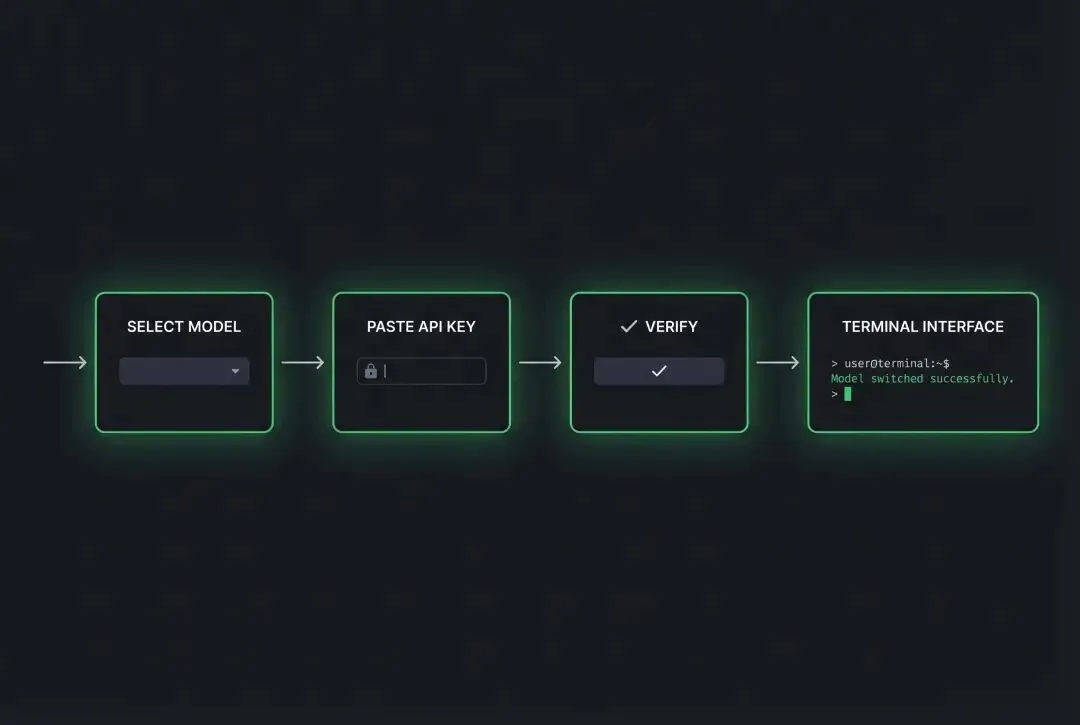 在向导中找到"模型选择"选项,用上下键切换到目标模型(需提前获取对应 API Key,已保存的可直接复用)。