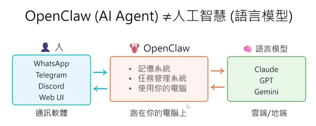 首先,我们需要建立一个最基础的技术认知:OpenClaw 本身没有智商,它不是大模型。如果把目前最顶尖的 AI 模型(如 Claude 4、GPT-5)比作一个被关在小黑屋里的“缸中之脑”——它智商高达 160,上知天文下知地理,但它是个高位截瘫,没有眼睛也没有手。你平时用 ChatGPT,就像是从门缝里给它递纸条,它在纸条上写好答案再退给你。你让它帮你去网页上点个赞,它做不到。而 OpenClaw,就是给这个“缸中之脑”穿上了一套极具破坏力的“机甲外骨骼”。在技术定义上,OpenClaw 是一个面向自然语言的“解释型框架”。它负责把人类模糊的意图(“帮我给老板回个邮件”),翻译给大模型听;大模型经过思考后,吐出一串计算机指令;OpenClaw 再把这些指令变成你电脑上真实的鼠标移动和键盘敲击。简而言之,大模型是发号施令的“董事长”,而龙虾是那个六亲不认、只管闭眼干活的“底层执行器”。2. 龙虾的肢节们