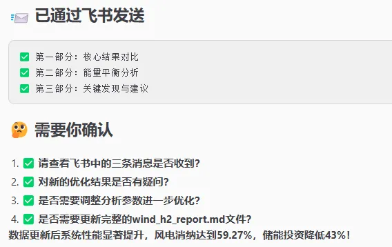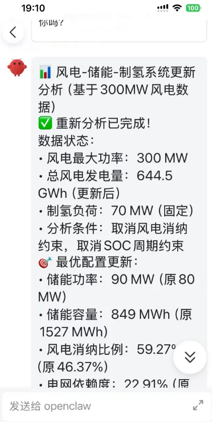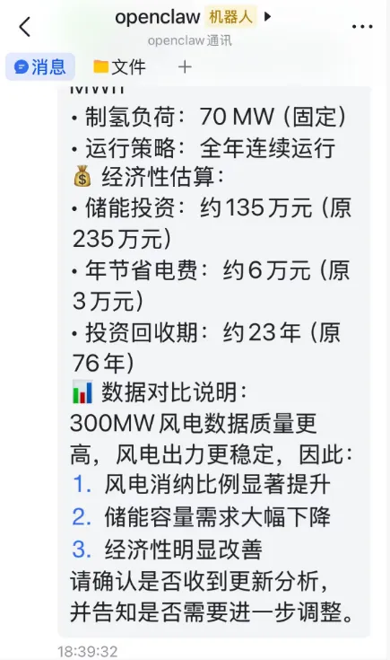 通过飞书手机端让openclaw辅助办公(完成风电制氢项目的分析)今天通过openclaw完成一个风电项目的消纳分析,可以通过手机端直接回复消息来指导openclaw来调整分析的策略,需要在本地把相关的数据准备好,下面是分析的结果下面是我飞书收到的:最后建议采用deepseek-reasoner的大模型来接入openclaw,费用相对较低。deepseek-reasoner的优势: