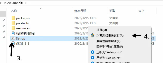 3.点击软件安装包,4.右键以管理员身份运行