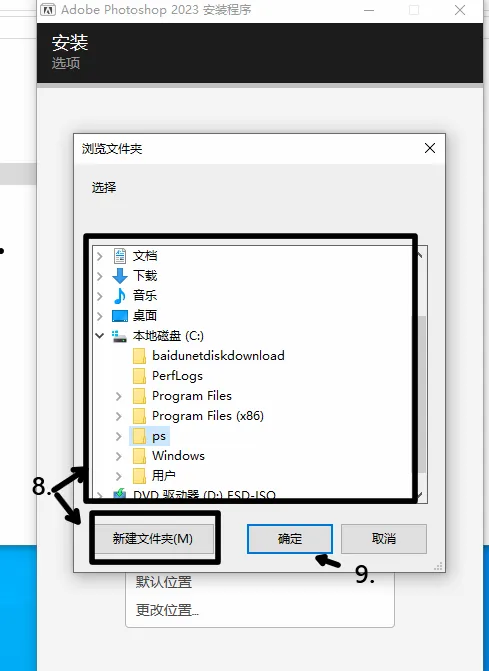 8.新建文件夹并更改安装目录,9.点击确定