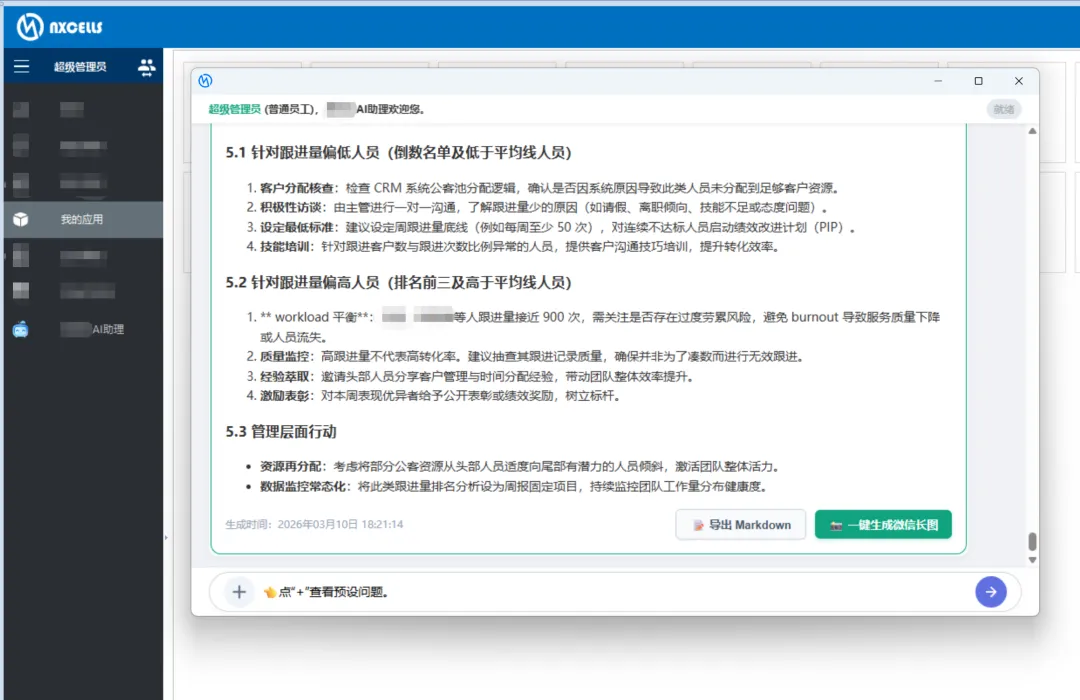 AI 经常胡说八道(幻觉)怎么办?我们的解法是:规则前置。 通过极其细致的 Prompt 调优、语义模型配置、业务知识配置以及智能体知识库的搭建,我们把一套极其严苛的“业务 SOP”和“深度诊断逻辑”注入了模型。它不仅会写 SQL,更知道我们公司的统计口径是什么,从而保证了输出结果的高度精准和可控。