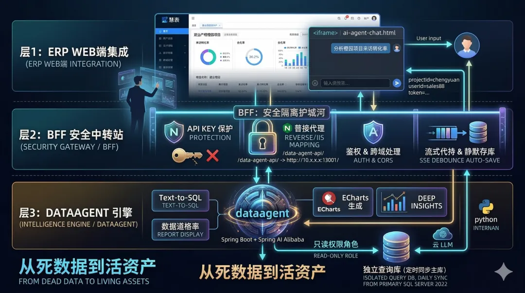 数据库隔离:AI 直接连主库是极其危险的。我们建立了一个独立的查询数据库,定时从主库同步所需的业务数据(客户、工程等),并为 AI Agent 限制了最低的只读权限角色。最大限度保证了主系统的数据绝对安全。 BFF 网关:我们增加了一层 Node.js BFF (Backend for Frontend) 网关。它不仅把大模型的 API Key 死死锁在了内网,还通过“静默代持和存库”机制,完美解决了原生 DataAgent 的局限性。哪怕业务员在生成报告中途锁屏了,BFF 依然能在后台稳稳接住数据并存入数据库,确保对话不断档。