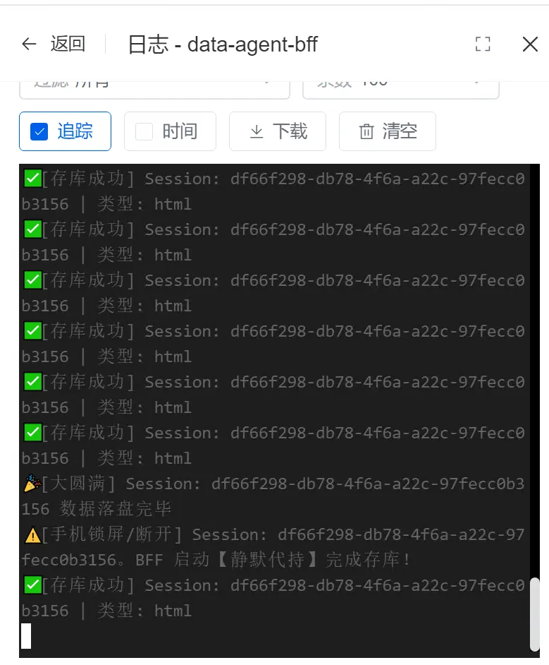 BFF 层是保护企业 API Key 和接管data-agent-frontend前端长连接的“桥头堡”。我们使用 Node.js 结合Express编写。下面展示了 server.js 中最核心的“流式拦截与断网兜底存库”逻辑片段: