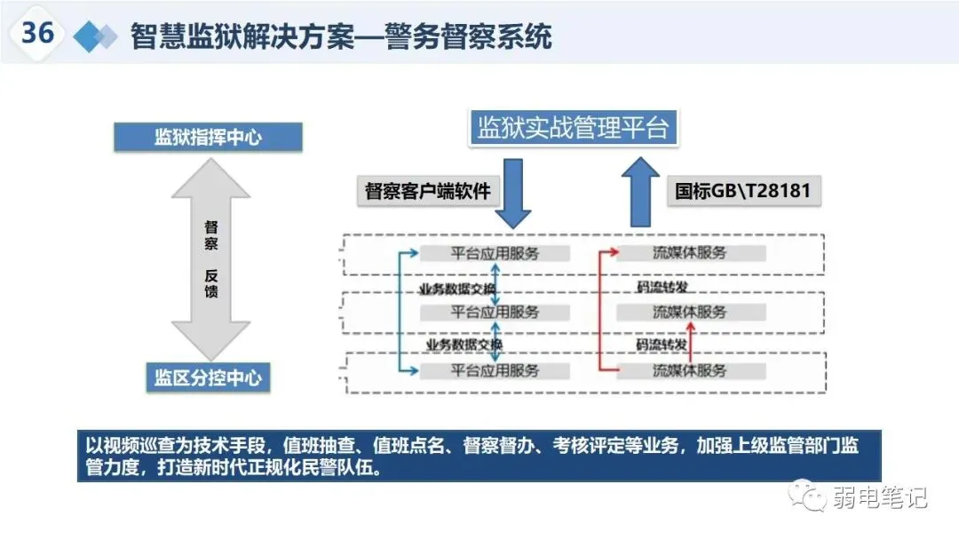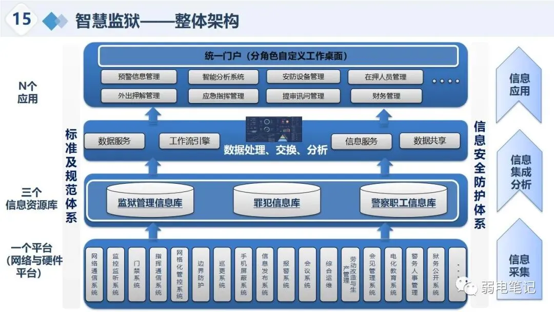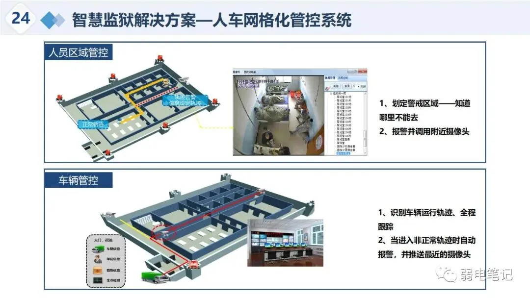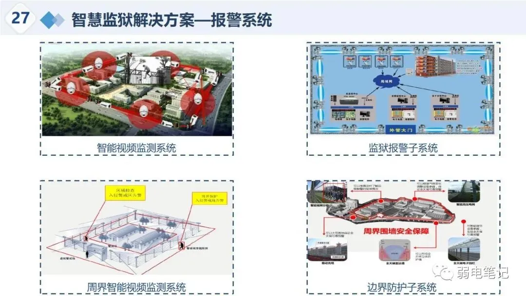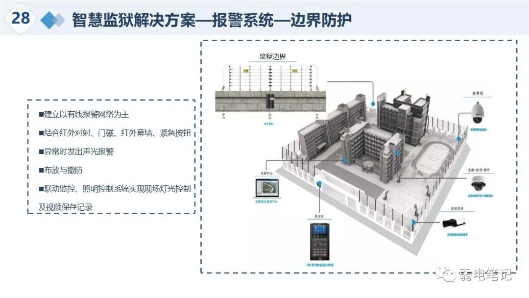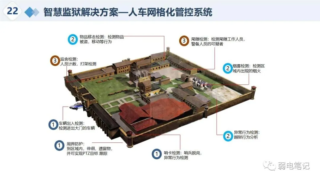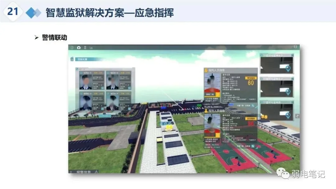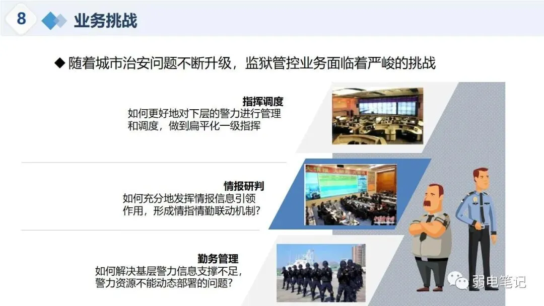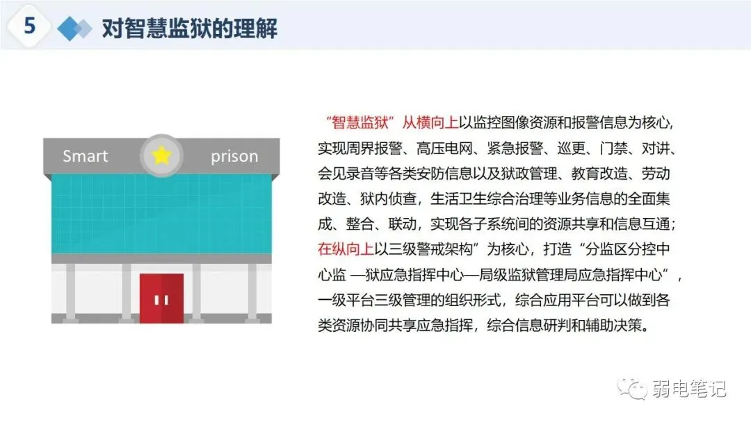 “智慧监狱”从横向上以监控图像资源和报警信息为核心,实现周界报警、高压电网、紧急报警、巡更、门禁、对讲、会见录音等各类安防信息以及狱政管理、教育改造、劳动改造、狱内侦查,生活卫生综合治理等业务信息的全面集成、整合、联动,实现各子系统间的资源共享和信息互通;