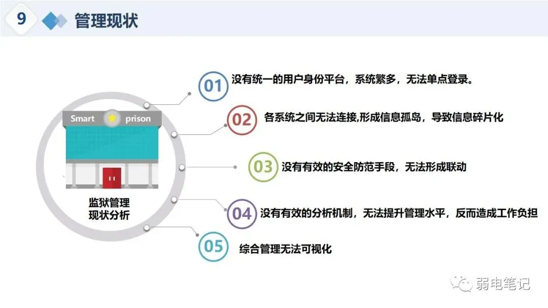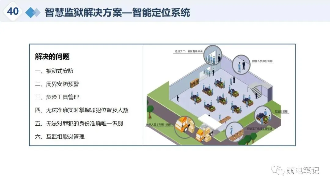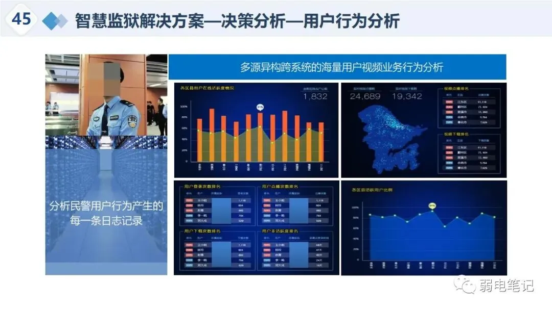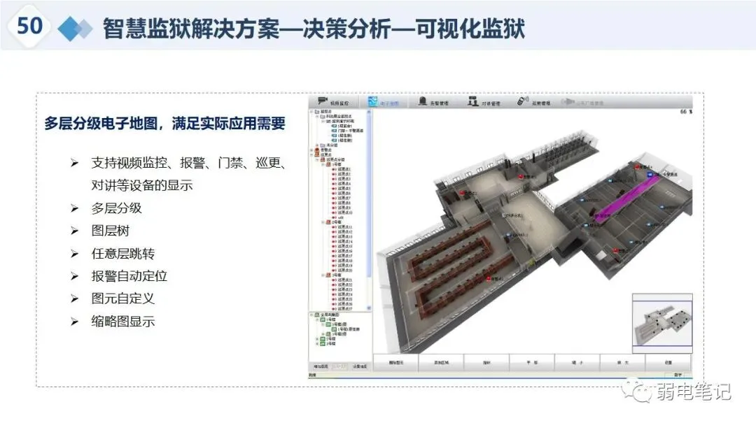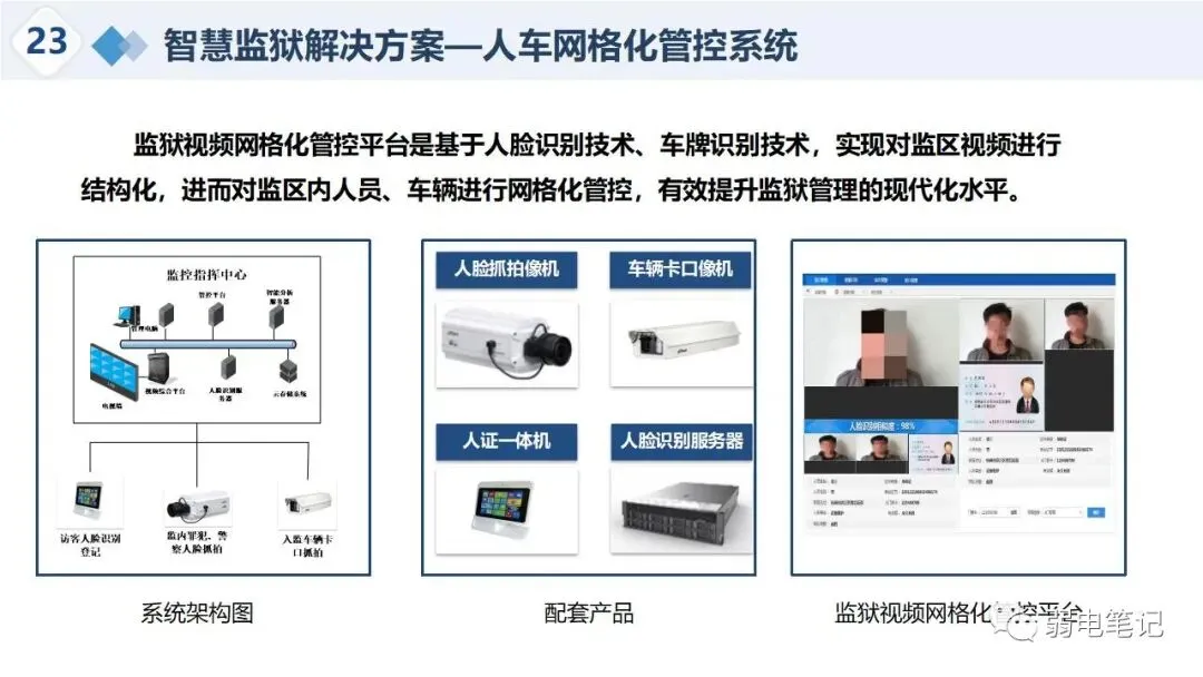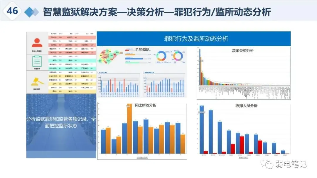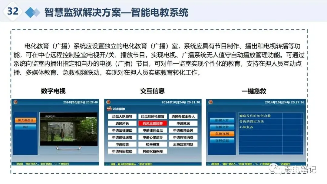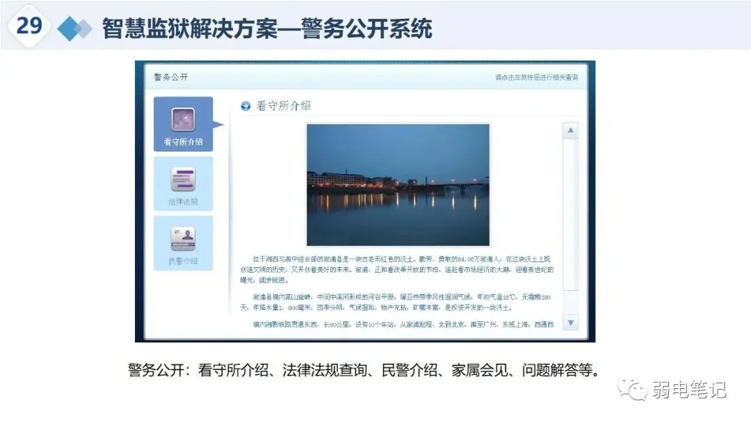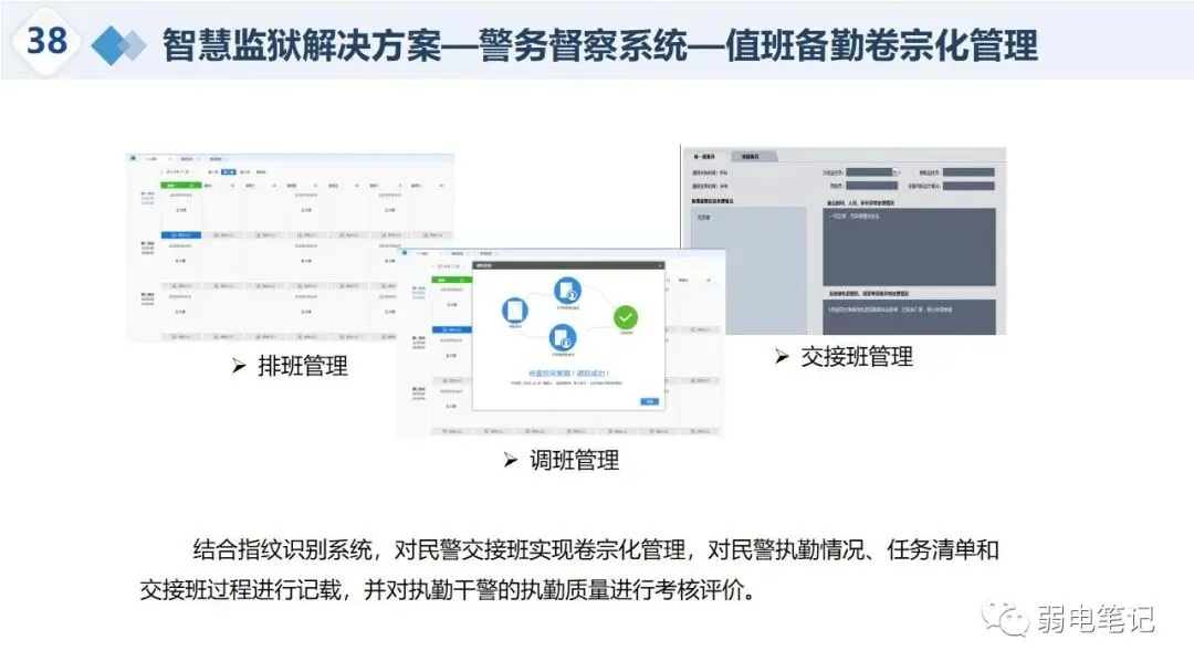 “智慧监狱”从横向上以监控图像资源和报警信息为核心,实现周界报警、高压电网、紧急报警、巡更、门禁、对讲、会见录音等各类安防信息以及狱政管理、教育改造、劳动改造、狱内侦查,生活卫生综合治理等业务信息的全面集成、整合、联动,实现各子系统间的资源共享和信息互通;
