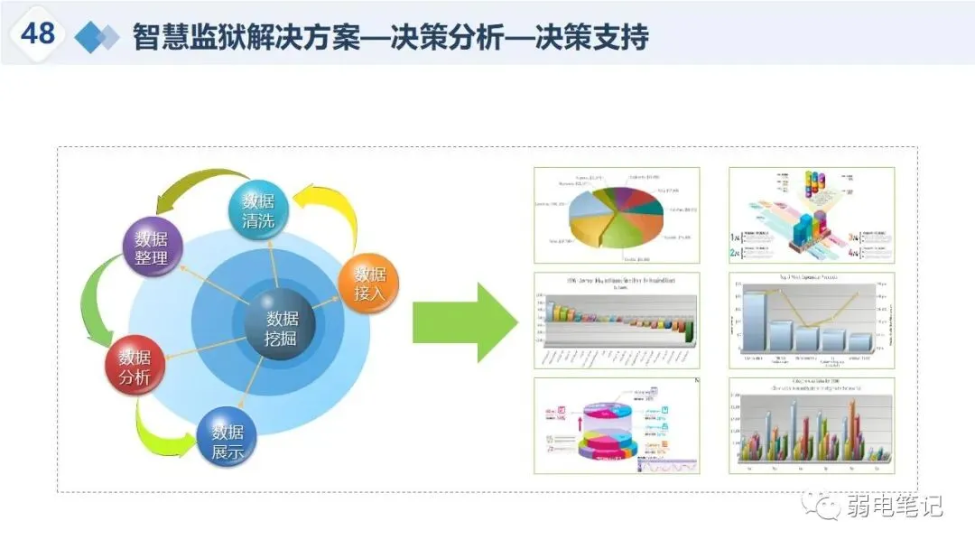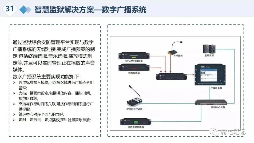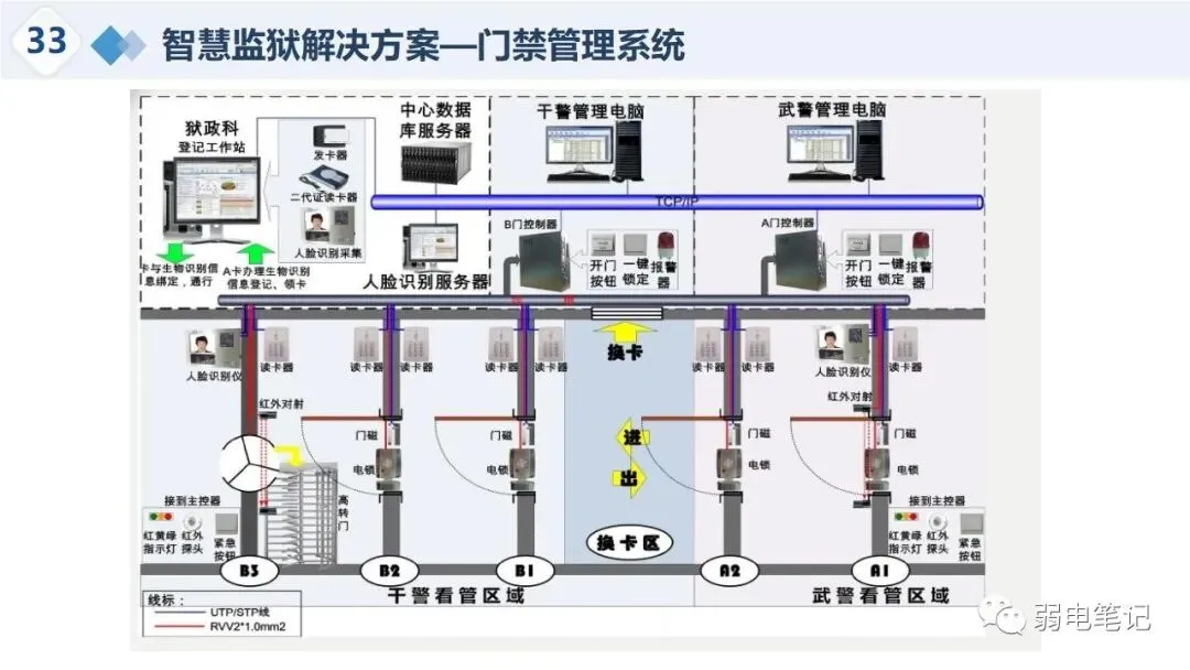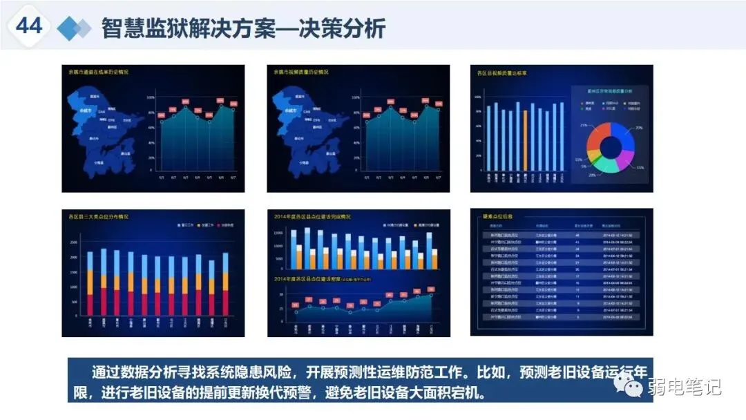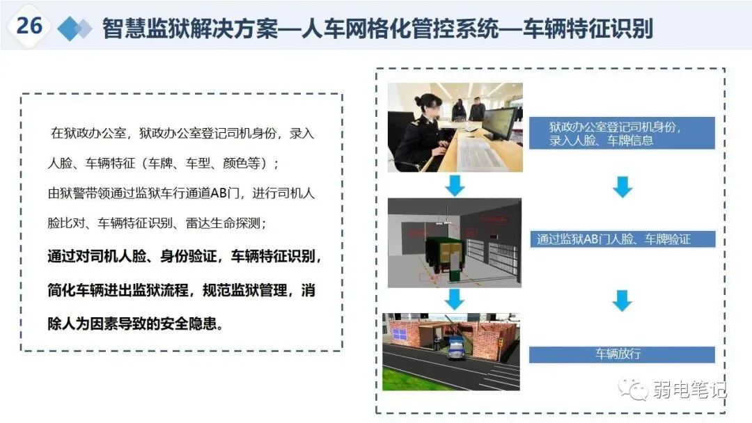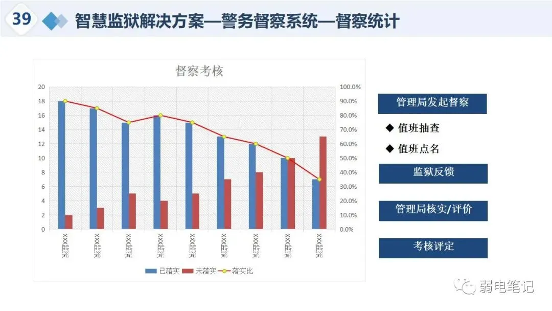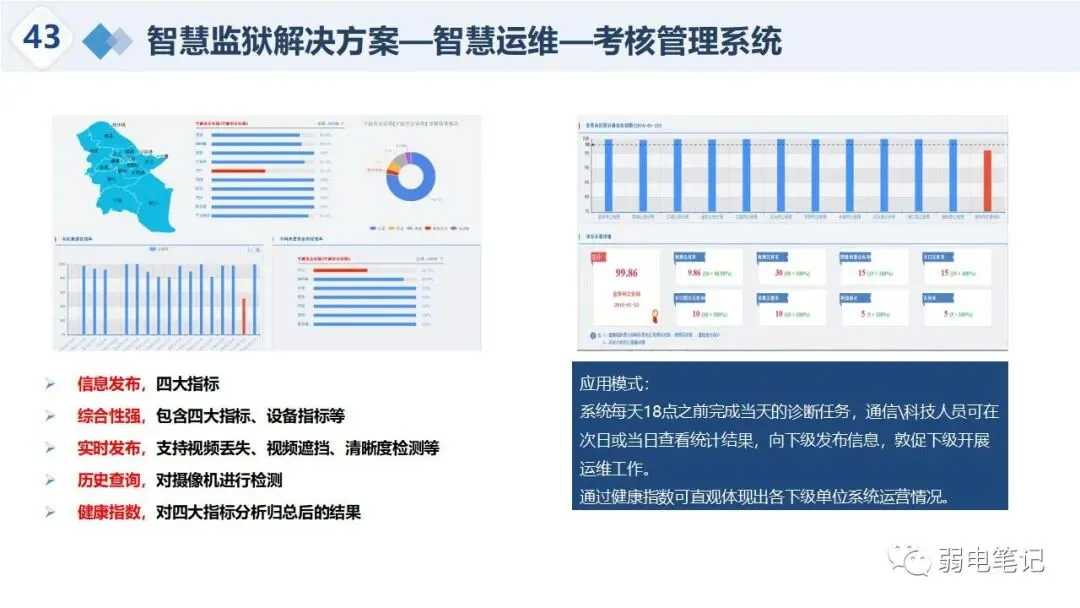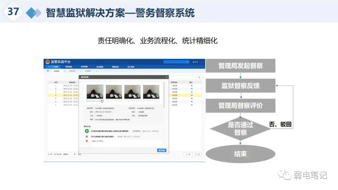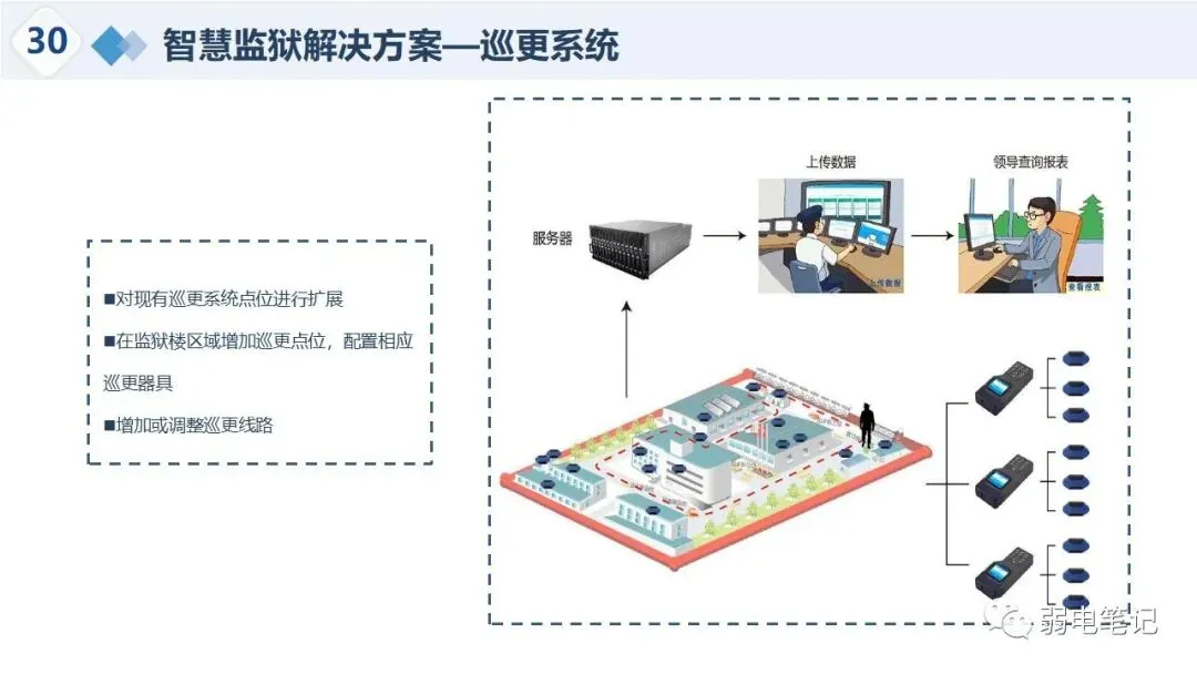 “智慧监狱”从横向上以监控图像资源和报警信息为核心,实现周界报警、高压电网、紧急报警、巡更、门禁、对讲、会见录音等各类安防信息以及狱政管理、教育改造、劳动改造、狱内侦查,生活卫生综合治理等业务信息的全面集成、整合、联动,实现各子系统间的资源共享和信息互通;