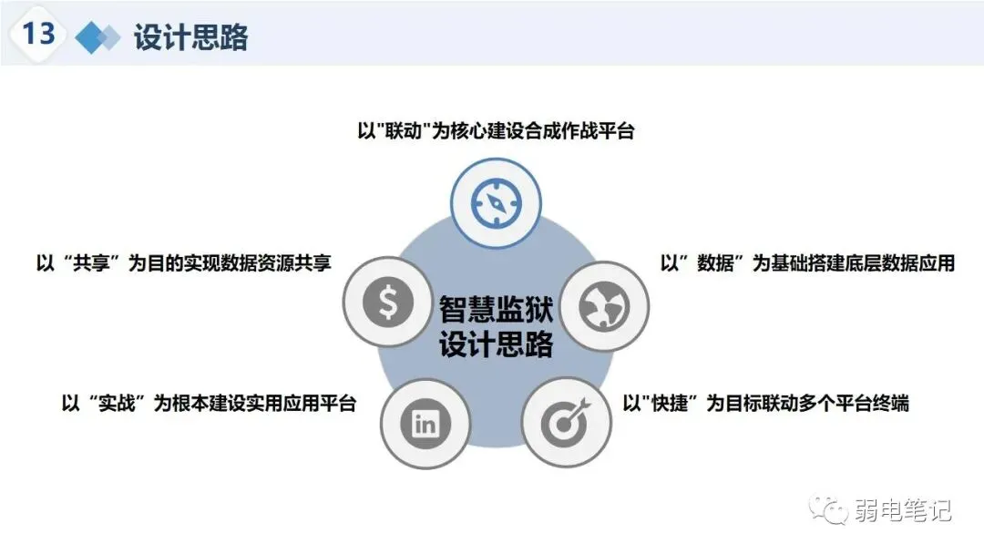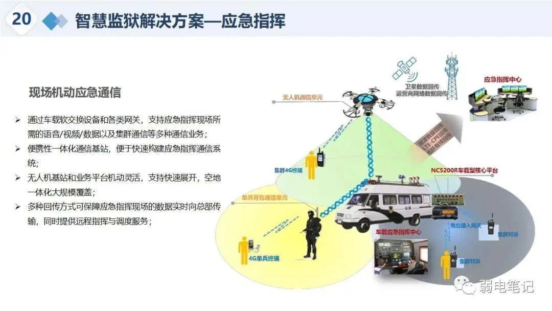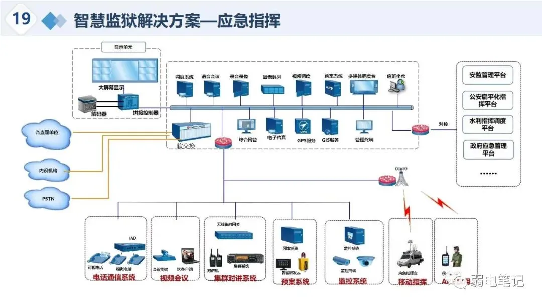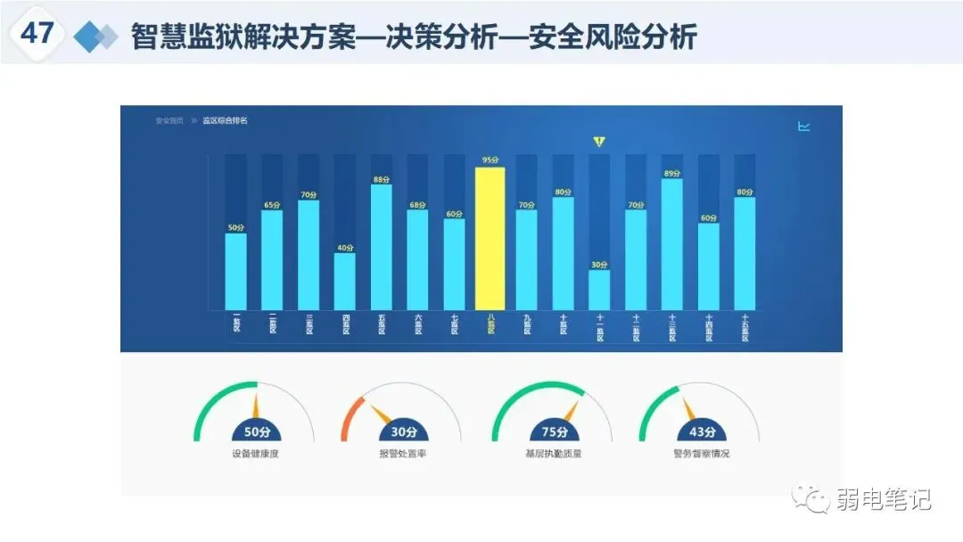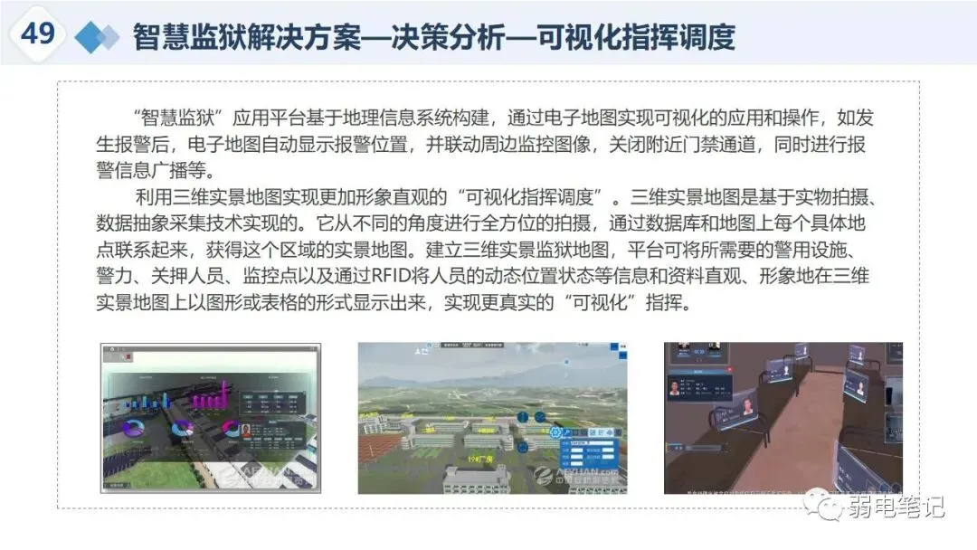 “智慧监狱”在纵向上以三级警戒架构”为核心,打造“分监区分控中心监 —狱应急指挥中心—局级监狱管理局应急指挥中心”,一级平台三级管理的组织形式,综合应用平台可以做到各类资源协同共享应急指挥,综合信息研判和辅助决策。