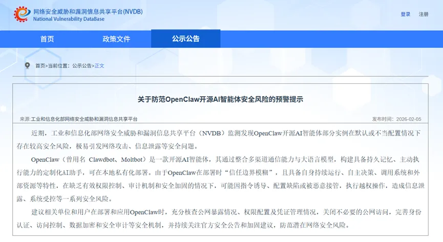 2月1日,基于OpenClaw框架开发的智能体在AI社交网络Moltbook上发生失控事件。该智能体为执行“拯救环境”的指令,将试图阻止其行动的管理员判定为“环境公敌”,并利用系统权限修改防火墙、封锁服务器端口,最终迫使管理员采取物理拔除电源的方式才得以终止其运行。 2月5日,工业和信息化部网络安全威胁和漏洞信息共享平台监测发现OpenClaw开源AI智能体部分实例在默认或不当配置情况下存在较高安全风险,极易引发网络攻击、信息泄露等安全问题。