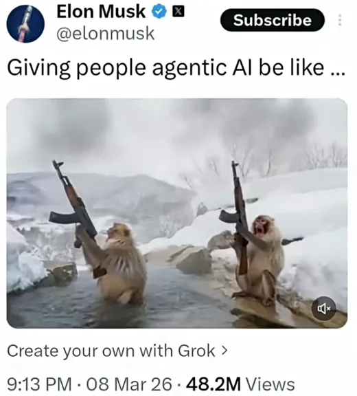 3月8日,马斯克怒批养虾潮,警示人们别做被AI牵着走的第四只猴子。