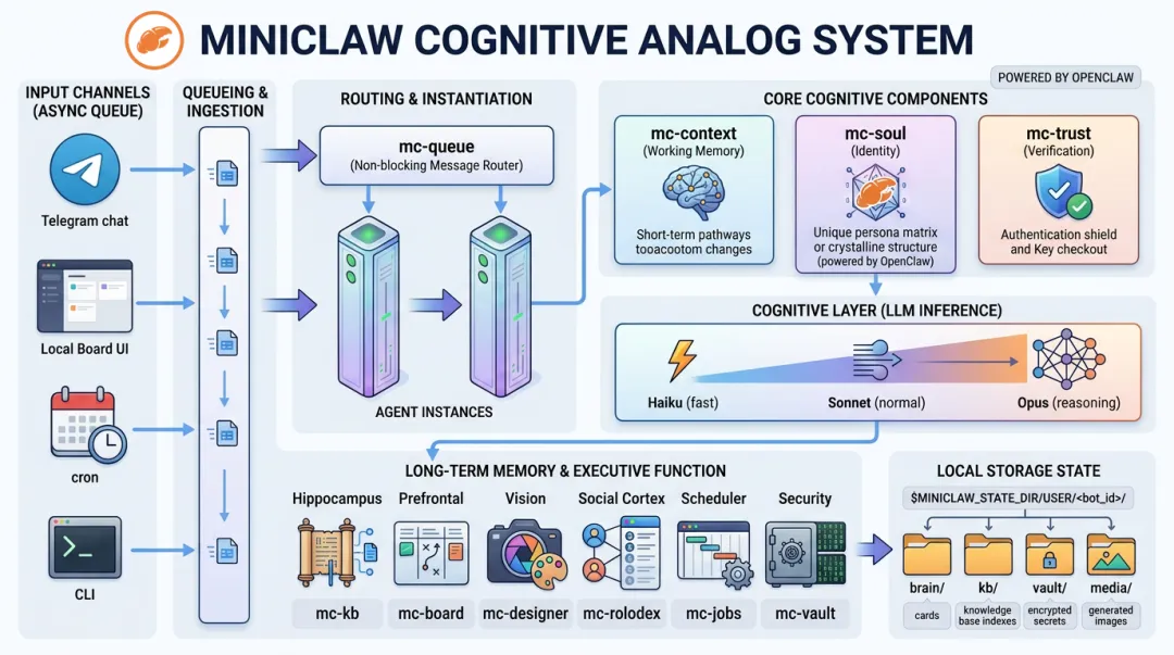 最右边是数据落地结构。所有数据保存在:$MINICLAW_STATE_DIR/USER/