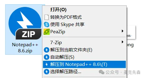 1.打开下载好的文件夹找到压缩包鼠标右键选择【解压到Notepad++ 8.6\】。