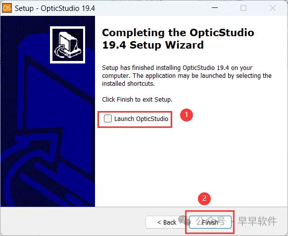 13、不勾选【Launch OpticStudio】,再点击【Finish】