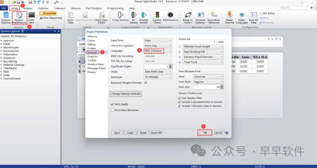 25、依次点击【Setup】、【OpticStudio Preferences】、【General】,Language选择【中文(Chinese)】,再点击【OK】