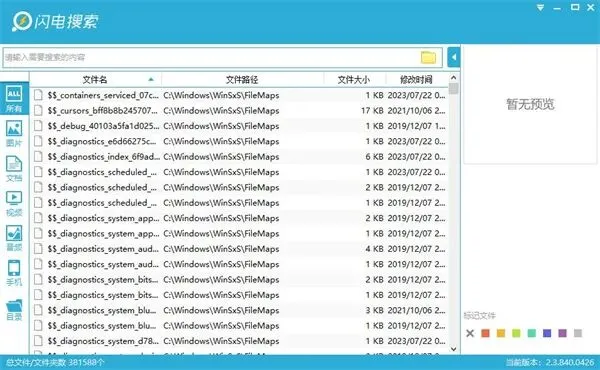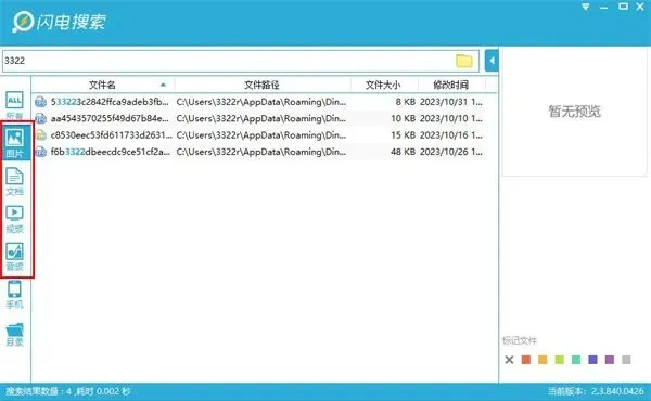 打开闪电搜索主界面,直接在搜索栏里输入文件名(比如 3322),下方就会实时显示出所有匹配的结果,包括图片、文档、视频等。