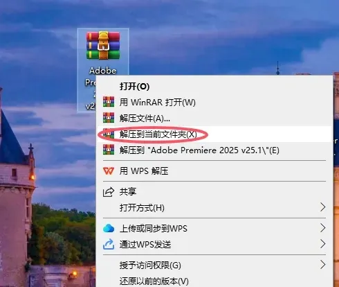 1.打开下载好的Pr软件安装包,鼠标右击压缩包选择【解压到当前文件夹】。