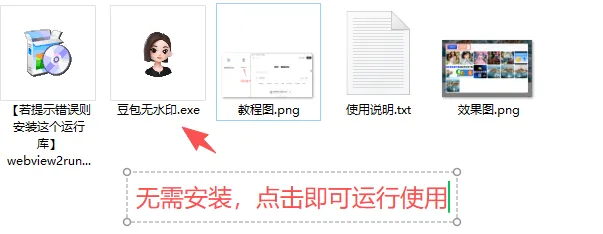 今天的这款软件,体积非常迷你,大家拿到手后,甚至都不需要安装,如下图所示,解压出来直接双击那个“豆包无水印”的程序就能运行,十分的便捷,通俗点说:即点即用,用完即走,完全不占地儿。
