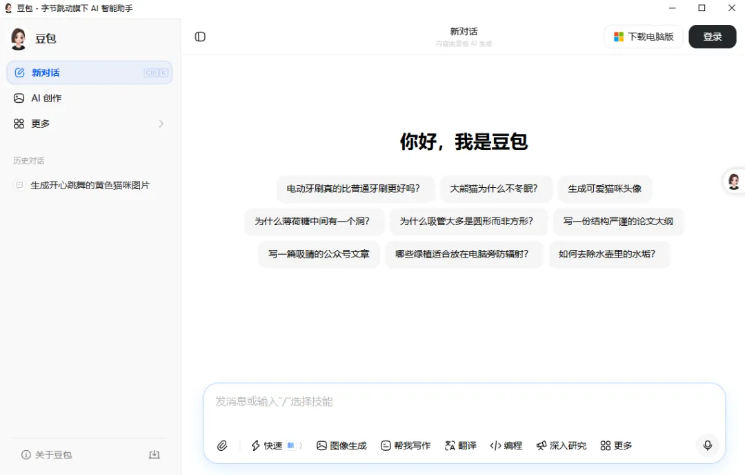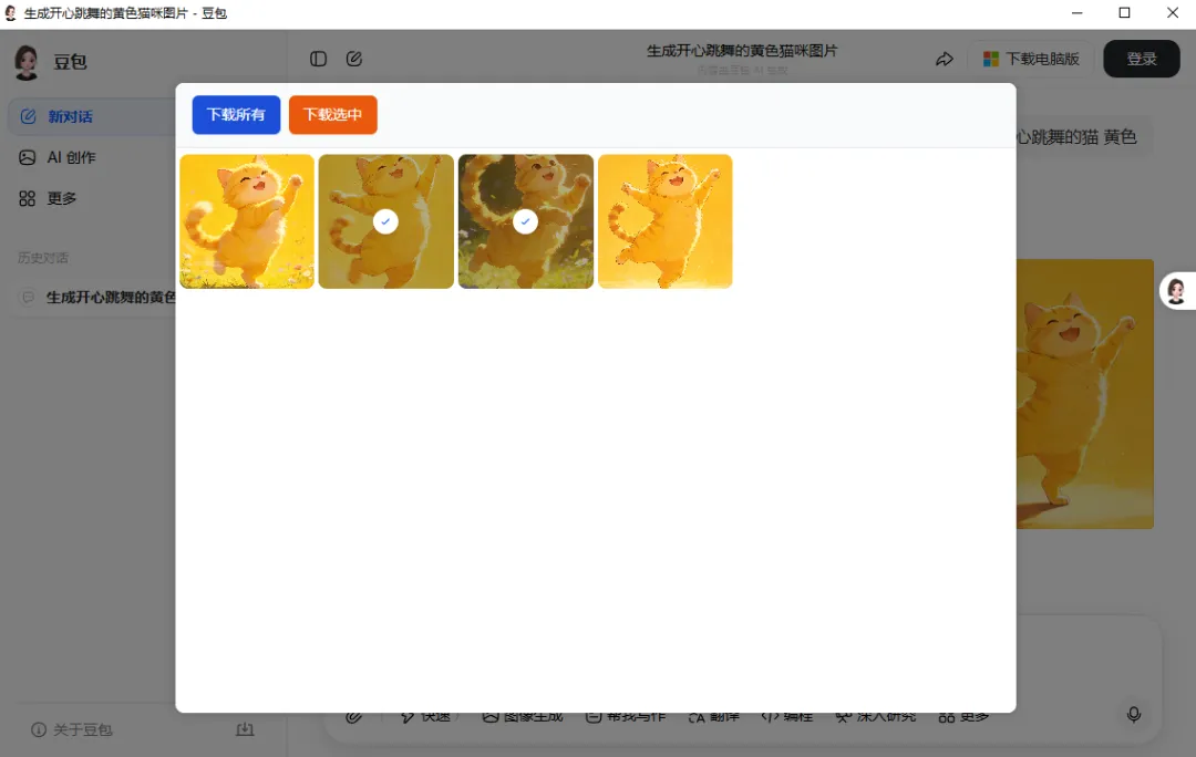 软件的主界面就是豆包界面。你只需要豆包上生成图片,生成完之后就可以选择单独下载或者多图全选下载,画质没有任何损失,依旧是高清大图,特别强大。