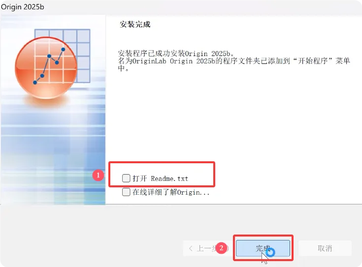 17.①取消勾选“打开Readme.txt”,②点击“完成”。