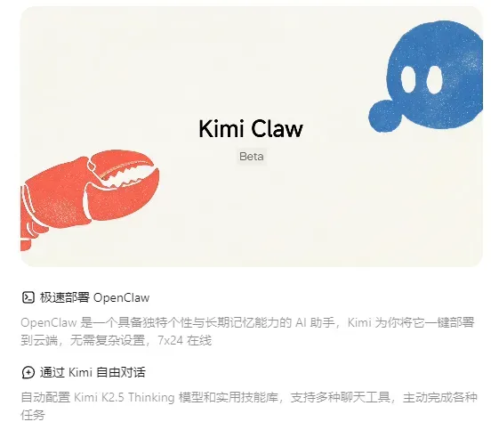 KimiClaw是Moonshot的云平台,支持Kimi K2.5模型,内置5000+技能和40GB存储。无本地硬件需求,适合浏览器用户。