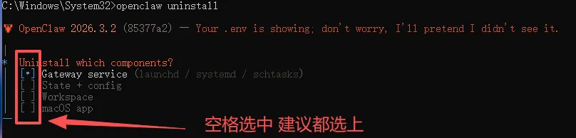 C:\Windows\System32>openclaw uninstall🦞 OpenClaw 2026.3.2 (85377a2) — Your .env is showing; don't worry, I'll pretend I didn't see it.|* Uninstall which components?| [+] Gateway service (launchd / systemd / schtasks)| [+] State + config (~/.openclaw)| [+] Workspace (agent files)| [ ] macOS app—