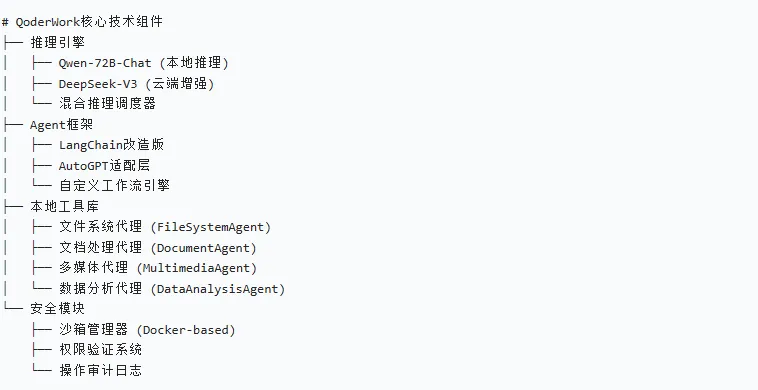 QoderWork围绕 “大模型推理 + 智能 Agent + 本地工具链 + 安全管控” 四大核心维度构建,从底层依赖到上层应用形成完整技术闭环,具体拆解如下:
