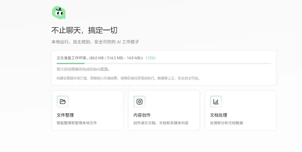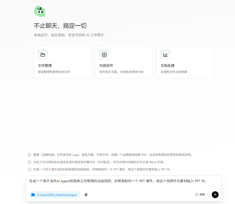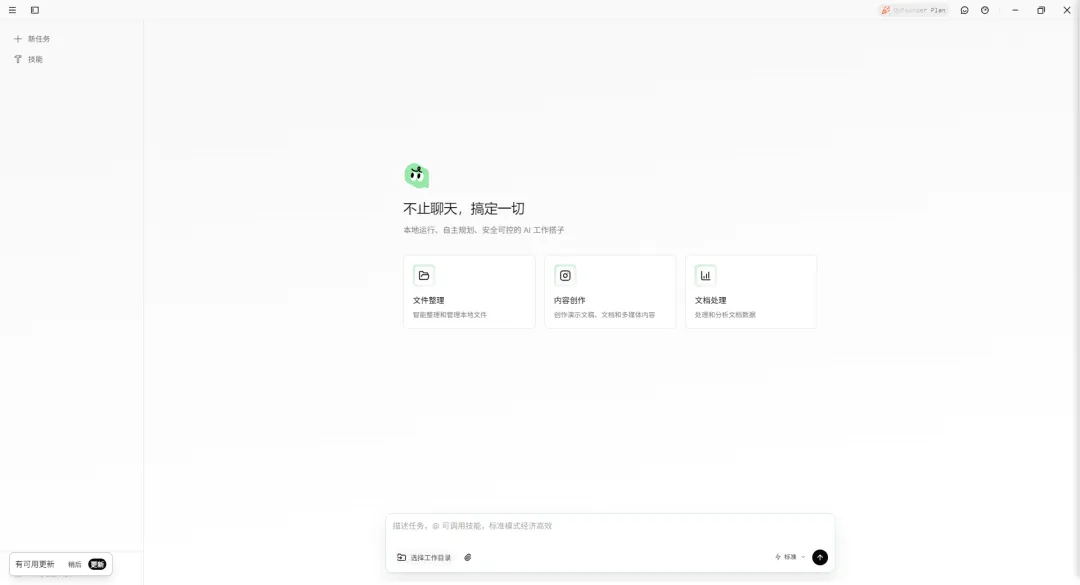 主界面左边是 “新任务” 入口,中间为三大功能区,底部是提示词输入聊天框。